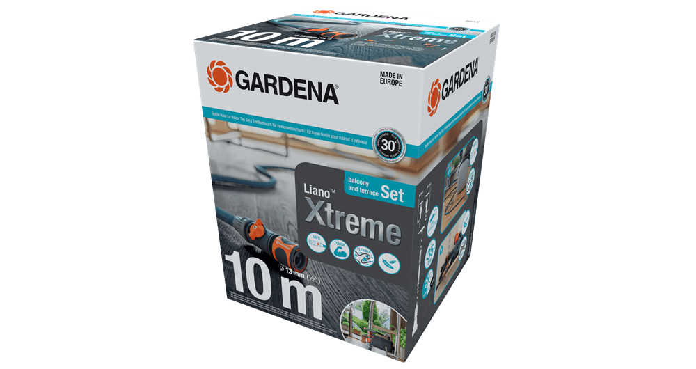 GARDENA Tekstilna cev Liano™ Xtreme 10 m s priključkom za notranje pipe je vaš popoln komplet Liano™ za učinkovito in varno namakanje na balkonu ali terasi. Komplet vsebuje 10 m cevi s premerom 13 mm (1/2″), brizgalko za namakanje, priključek za notranjo cev Liano™ z regulacijskim ventilom, stop nastavek za cev Liano™ in priključek za pipe za notranje pipe. Priključite Liano ™ Xtreme cev za vodo na notranje pipe v samo nekaj preprostih korakih za varen transport vode iz vaše kuhinje ali kopalnice. Vse komponente so varno pritrjene in povezava je zaščitena pred kapljanjem zahvaljujoč regulacijskemu ventilu in zapori za vodo. Udobno zalivanje rastlin na balkonu in terasi. Po zalivanju zaprite ventil in ga odklopite iz pipe. Preostalo vodo v vodni cevi učinkovito porabite tako, da jo s pomočjo regulacijskega ventila odtočite v bližnji lonec. Zahvaljujoč zelo fleksibilni PVC notranji cevi, Liano™ Xtreme navdušuje s svojo visoko zmogljivostjo, medtem ko je zunanja cev iz izjemno odporne tekstilne tkanine vzdržljiva in ščiti občutljive površine. Vlečenje cevi skozi prostore je enostavno zaradi majhne teže saj ima Liano™ Xtreme le polovico teže običajnih PVC cevi. Zahvaljujoč prijetnemu otipu cev gladko premikate po domu. Zaradi svoje elastičnosti se na primer ne bo zataknila za nogo stola. prilagodljivost olajša tudi shranjevanje, saj se idealno prilega razpoložljivemu prostoru za shranjevanje. Cev ima razpočni tlak 35 barov. Je zelo vzdržljiva, odporna na UV žarke in proti zmrzali in jo s tem lahko pustite zunaj vse leto. Liano™ Xtreme je brez škodljivih snovi in zato brez ftalatov (<0,1 %) ter brez kadmija, svinca in barija (<0,1 %). Tekstilna cev Liano™ Xtreme 10 m s priključkom za pipe za notranje pipe in vrečko za shranjevanje je kakovosten izdelek, izdelan v Evropi, s 30-letno garancijo proizvajalca GARDENA pri registraciji na gardena.com/registration v 3 mesecih od datuma nakupa. Ustvarjen za ekstrem. Zasnovan za vsakdan. Tekstilne cevi Liano™.